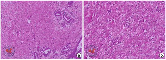 图3 乳腺及副乳腺假血管瘤样间质增生患者左腋窝肿块镜下表现 a图所示肿块镜下边界不清,梭形细胞增生伴致密胶原沉积,穿插于乳腺小叶间及小叶内(HE ×100);b图所示梭形细胞形态温和,排列成大小不等、不规则裂隙状结构,未见明显核分裂象(HE ×200) |