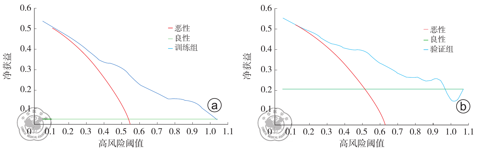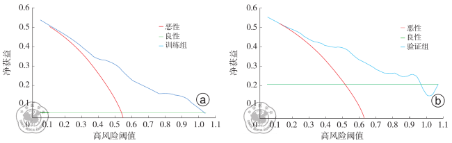338例患者的377个BI-RADS 4类结节(202个良性和175个恶性),分为训练组263个,验证组114个。年龄(OR =1.06,95%CI:1.03~1.08,P<0.001)、边界(OR=2.22,95%CI:1.19~4.13,P=0.012)、形态(OR=1.96,95%CI:1.01~3.77,P=0.045)、钙化(OR =2.43,95%CI:1.35~4.36,P=0.003)、结节最大直径(OR =1.93,95%CI:1.38~2.69,P<0.001)和内部血流(OR=1.95,95%CI:1.08~3.51,P=0.026)是乳腺癌的独立预测因素。训练组和验证组通过列线图画出的ROC曲线下面积(AUC)分别为0.807(95%CI:0.755~0.858)和0.837(95%CI:0.764~0.910)。列线图预测模型具有良好拟合度(训练组:P=0.656;验证组:P=0.502);校准曲线表明列线图模型与实际观测结果有较好的一致性。DCA显示示当阈值概率大于0.1时,该模型预测净获益值较高。