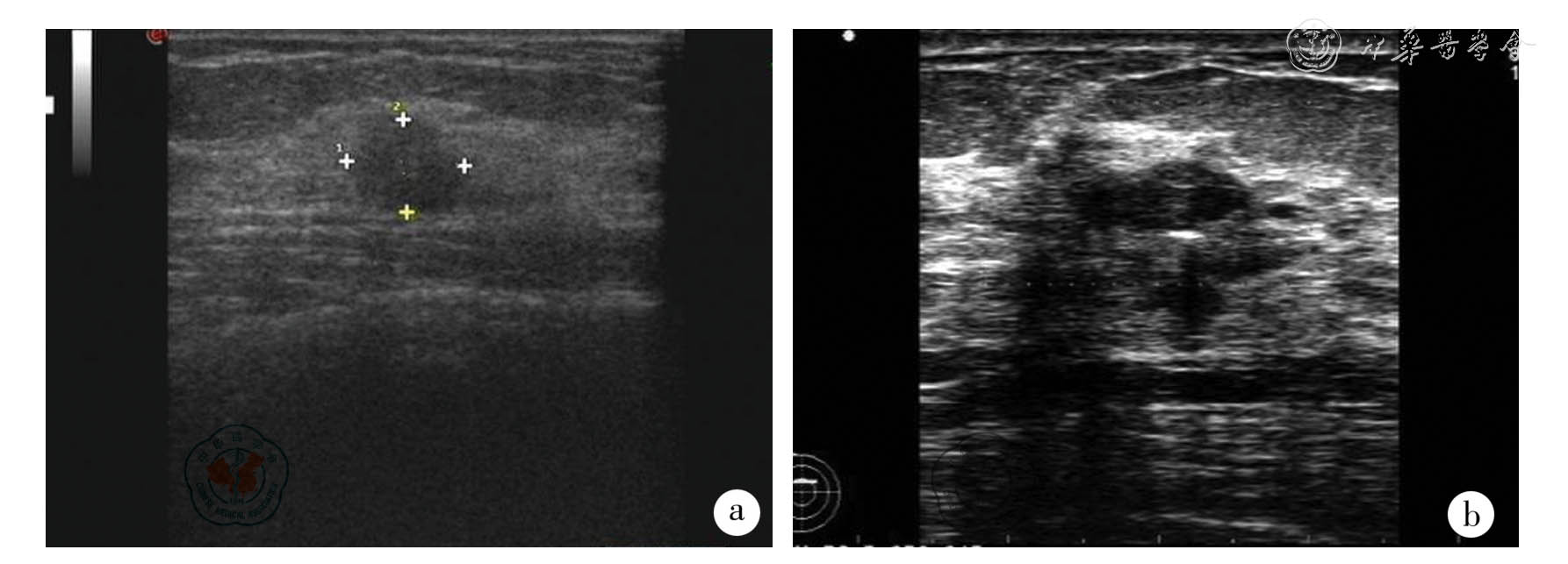 图1 2 例恶性病例术前超声图a:50 岁患者,超声示10.6 mm (横径)×8.5 mm (纵径)低回声占位,BI-RADS 3 级,病理检查示浸润性导管癌;b:55 岁患者,超声示10.87 mm(横径)×4.82 mm(纵径)低回声占位,BI-RADS 3 级,病理结果示浸润性导管癌。 |
