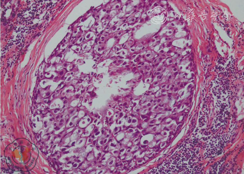 | 分组 | 恶性病例 | 平均年龄(岁) | 直径(cm) | 病理类型(例) | TNM分期(例) | ||