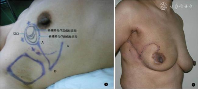 In our study of breast conserving surgery,all the patients were treated by extended tumor resection.The surgical margin was at least 0.5 cm,and the skin that invaded by the tumor was resected together.Then a triangular lateral thoracodorsal fasciocutaneous flap was designed to fill the skin defect,and the incision was used to complete the axillary lymph node dissection.