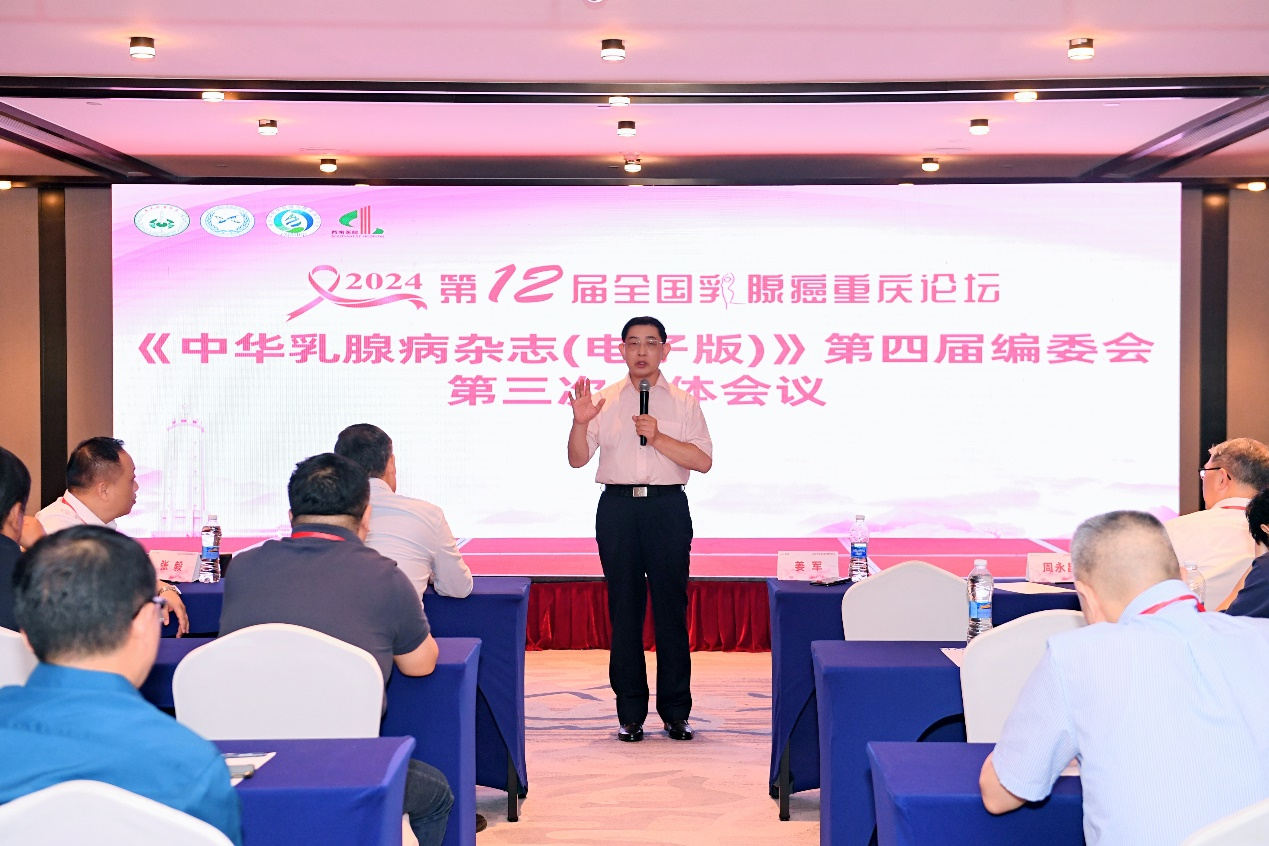 2024年9月20日,《中华乳腺病杂志(电子版)》第四届编委会第三次全体会议在重庆诺富特酒店顺利召开,宋尔卫院士、姜军教授、张毅教授、周永昌教授等第四届编委会及通讯编委成员50余人参会。姜军总编辑汇报了《中华乳腺病杂志(电子版)》近年来的工作,宋尔卫院士为期刊发展致辞,各位编委肯定了编辑部的工作成绩,并纷纷发言,为杂志以后的发展提出意见和建议。